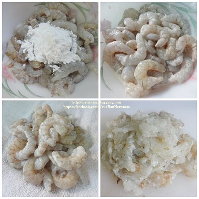 ล้างทำความสะอาดกุ้งแกะเปลือก เอาหัว หาง และดึงเส้นดำออก โรยแป้งมันสำปะหลังลงบนกุ้ง