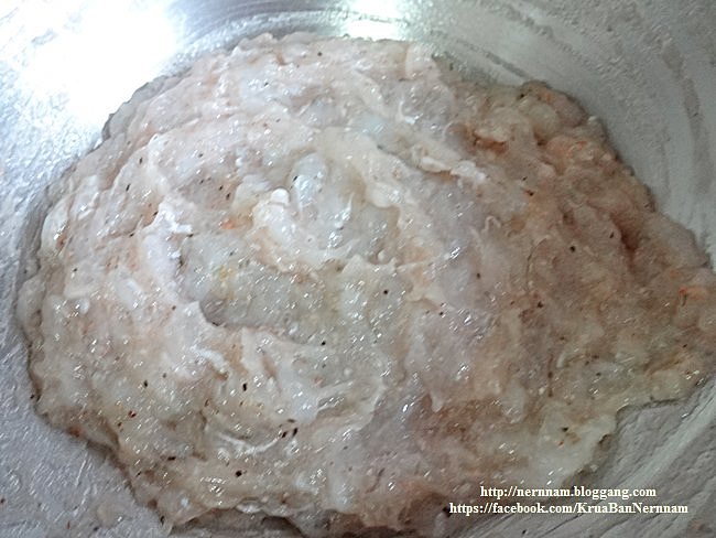 ผสมเนื้อกุ้ง มันหมูแข็ง ไข่ขาว พริกไทยดำ นวดให้เข้ากันจนเหนียว ฟาดกับอ่างผสมนั่นแหละจ้า
