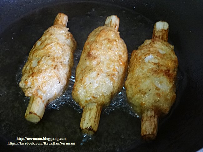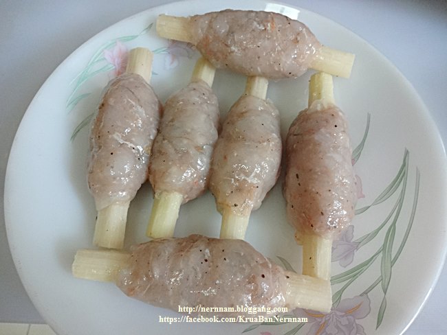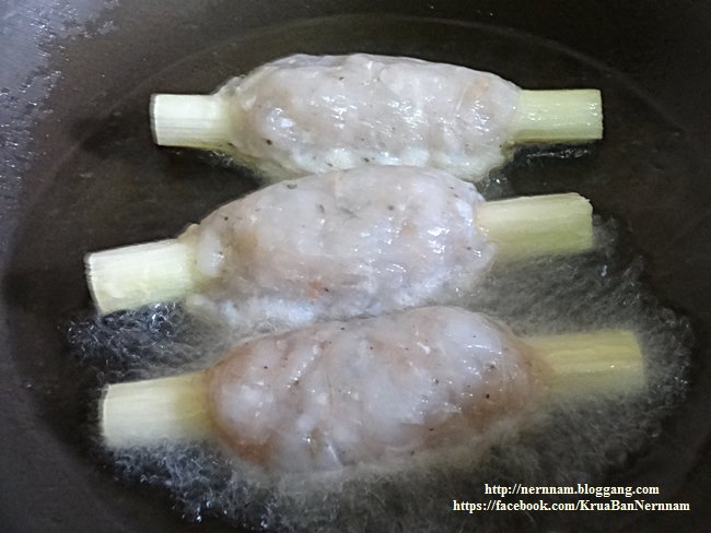นำน้ำมันพืชทามือเล็กน้อยให้ทั่วแผ่เนื้อกุ้งมาหุ้มรอบแท่งอ้อย ปั้นเป็นรูปรีและเหลือส่วนปลายอ้อยทั้ง 2 ด้านไว้