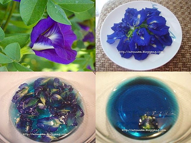 ดอกอัญชัญล้างทำความสะอาด แช่ในน้ำอุ่นเพื่อให้ออกสีน้ำเงินเตรียมไว้
