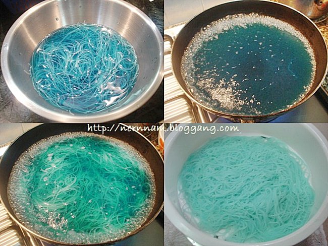 นำเส้นหมี่แช่ในน้ำดอกอัญชัญ และลวกในน้ำเดือด ผึ่งให้สะเด็ดน้ำ
