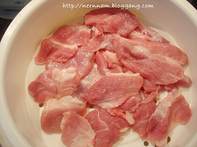 ล้างทำความสะอาดหมู หั่นชิ้นใหญ่หนาประมาณ 1/2 นิ้วพักให้สะเด็ดน้ำ