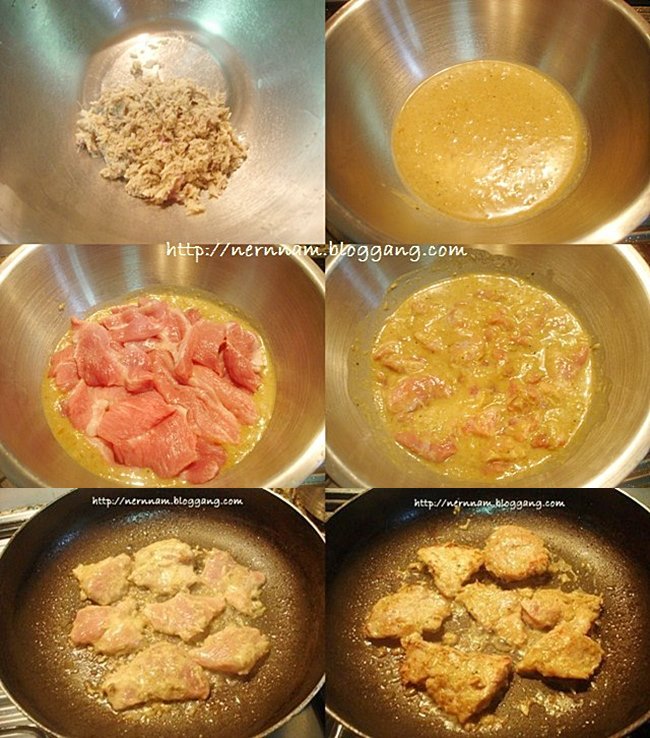 จากนั้นใส่เนื้อหมูลงคลุกเคล้าให้เข้ากันหมักไว้ประมาณ 2 ชั่วโมง นำมาอบหรือย่างให้สุก