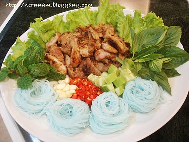 เส้นหมี่ขาวลวก เพื่อให้ได้สีฟ้าจึงแช่ในน้ำดอกอัญชัญ ผักเครื่องเคียงกับน้ำจิ้ม เราใช้สูตรเดียวกับกุ้งพันอ้อยค่ะ
