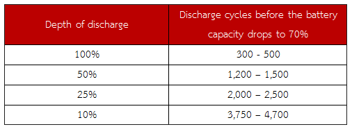 Depth of discharge คือ ปริมาณแบตเตอรี่ที่ถูกใช้ไป เช่น Depth of discharge 100% เท่ากับแบตเตอรี่ถูกใช้งานเหลือ 0%, Depth of charge 10% เท่ากับ แบตเตอรี่เหลือ 90%)