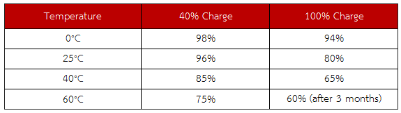 ผลการทดลองพบว่าที่อุณหภูมิยิ่งสูง ยิ่งร้อน แบตเตอรี่ยิ่งเสื่อมสภาพมากครับ ที่ 60 องศาเซลเซียส แบตเตอรี่ 40% ที่ ถูกทิ้งไว้มีความจุเมื่อชาร์จเต็มลดลงไป 75% จากเดิม ขณะที่แบตเตอรี่ 100% มีความจุเมื่อชาร์จเต็มลดไปเป็น 60% ภายในเวลาเพียง 3 เดือนเท่านั้น! จะเห็นว่าแบตเตอรี่ที่มีแรงดันไฟฟ้าสูงกว่าก็จะเสื่อมเร็วกว่าด้วยครับ