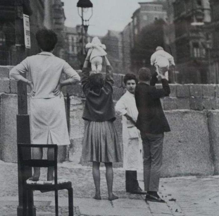 25. พ่อและแม่ที่อาศัยอยู่ในฝั่งกำแพงเบอร์ลินตะวันตกกำลังชูลูกของพวกเขาให้กับตาและยายที่อาศัยอยู่ทางฝั่งเบอร์ลินตะวันออกดู ในปี 1961
