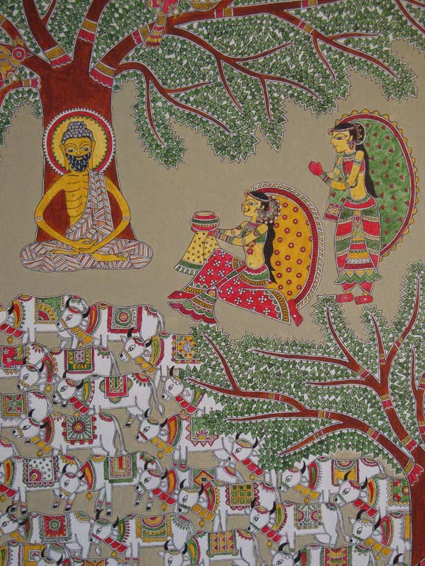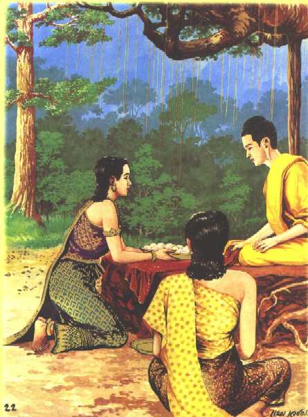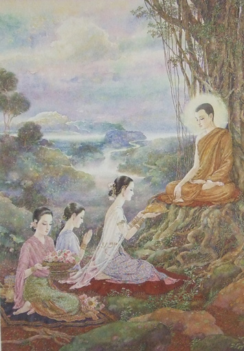 เช้าวันตรัสรู้ นางสุชาดากับทาสีมาถวายข้าวมธุปายาส โดยสำคัญว่าเทวดา