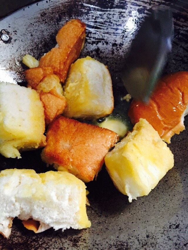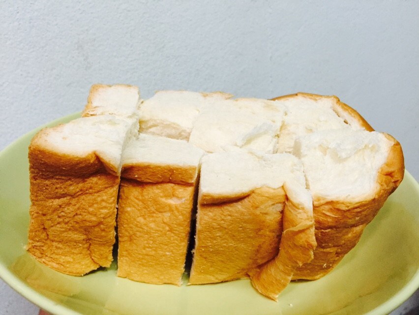 ขั้นแรก หั่นขนมปังเป็นชิ้นใหญ่ๆนะคะ (เนื่องจากไม่มีเตาอบหรืออะไรอบๆ เลยใช้กะทะแทนสะเลยยย)