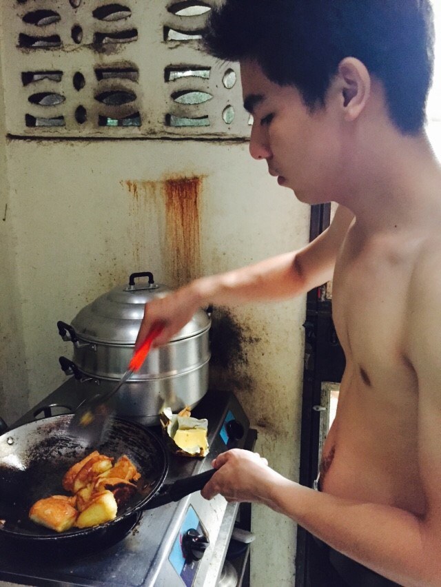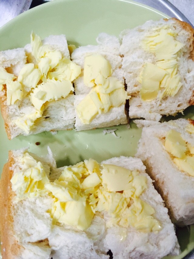 ตั้งไฟเลยนะคะไม่ต้องร้อนมาก เดี๋ยวขนมปังจะไหม้กันพอดี ที่สำคัญ ใช้เนยทาไปที่กะทะด้วยนะะะะ
