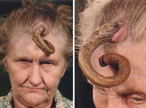 1. หญิงผู้มีเขางอกที่หน้าผาก อันเกิดจากเซลล์มะเร็งผิดปกติ