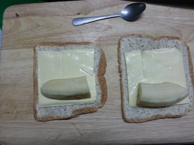 ได้ขนมปังที่แบนๆแล้วก็ เอาชีสวาง กล้วยวางเลยครับ ไม่แนะนำให้กล้วยหนามากนะครับไม่งั้นจะม้วนไม่ได้