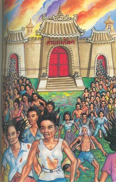 ภาพที่ 1 พระยายมและนายนิริยะบาล กำลังไต่สวนผู้ที่ตายไปแล้วใหม่ๆ โดยเป็นบัญชีเล่มใหญ่ตรวจตราดูโดยละเอียดว่า ใครเมื่อครั้งเป็นมนุษย์นั้นเคยทำบุญทำทานอะไรไว้บ้าง เช่น ผู้ชายท่านก็จะเน้นว่า เคยบวชเรียนเขียนอ่านพระธรรมวินัยไตรสิขาไหม เคยอยู่ในระเบียบวินัยแค่ไหนเพียงไร ถ้าเป็นฆราวาส ท่านก็จะเน้นถามเกี่ยวกับการรักษาศีลห้า เป็นหลักสำคัญ โดยมีเลขาฯ เปิดบัญชีอ่านอย่างละเอียด พระยายมผู้เสมือนหนึ่งผู้พิพากษานั่งบัลลังก์ คอยตัดสินพิจารณาชี้ขาดอย่างยุติธรรม ถ้าเห็นว่า บุคคลใดทำคุณงามความดี ทำบุญกุศลไว้มากเป็นพระก็เป็นพระที่ดี เป็นเณรก็เป็นเณรที่ดี เป็นประชาชนพลเมืองก็เป็นพลเมืองที่ดีของชาติ เป็นผู้มีศีลธรรมกัลยาณธรรมประจำใจว่า ผู้นั้นตอบตามความเป็นจริงหรือไม่ เพราะทางยมโลกมีบัญชีเป็นหลักฐาน ใครจะโกหกไม่ได้ มีโทษ ๒ เท่าทีเดียว