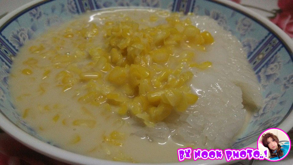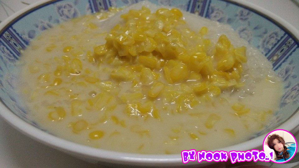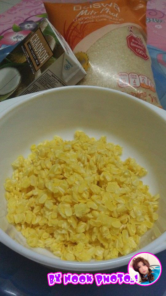 นำกะทิใส่หม้อ ใส่ข้าวโพด ตั้งไฟกลางๆจนเดือด เติมน้ำตาลใส่เกลือนิดๆ ชิดให้ได้รสตามชอบ