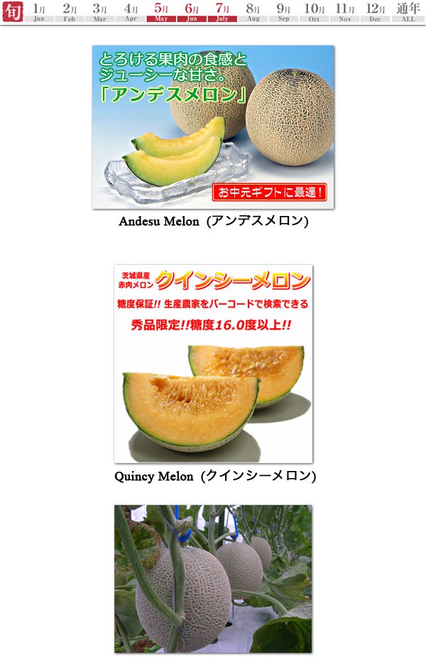 อันดับ 9 Melon (メロン) จากจังหวัด Ibaraki จังหวัดที่ปลูกเมล่อนมากที่สุดในญี่ปุ่น โดยมีสัดส่วนประมาณ 23% ของผลผลิตของเมล่อนทั้งประเทศ พันธุ์ที่มีชื่อเสียงก็ได้แก่ Andesu Melon (アンデスメロン) และ Quincy Melon (クインシーメロン) เมล่อนของจังหวัด Ibaraki มีจุดเด่นอยู่ที่ความหวานและความหอม เคล็ดลับในการรับประทานเมล่อนให้อร่อยก็คือ ให้เก็บเมล่อนไว้ในอุณหภูมิห้องโดยที่ไม่ต้องแช่เย็นก่อน เมื่อต้องการจะรับประทานแล้วจึงค่อยเอาไปแช่ตู้เย็นก่อนรับประทานประมาณ 2-3 ชั่วโมง วางจำหน่ายตั้งแต่เดือนพฤษภาคม ถึงเดือนกรกฏาคม