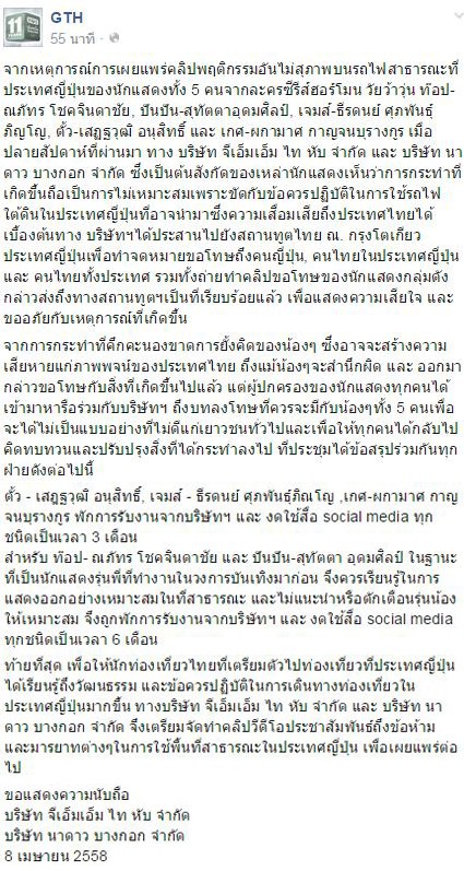 อย่างไรก็ตามทางต้นสังกัดได้ทำจดหมายไปยังสถานทูตไทย ณ กรุงโตเกียว เพื่อขอโทษถึงคนญี่ปุ่น, คนไทยในประเทศญี่ปุ่น และ คนไทยทั้งประเทศ รวมทั้งถ่ายทำคลิปขอโทษของนักแสดงกลุ่มดังกล่าวส่งถึงทางสถานทูตฯเป็นที่เรียบร้อยแล้ว เพื่อแสดงความเสียใจ และขออภัยกับเหตุการณ์ที่เกิดขึ้น