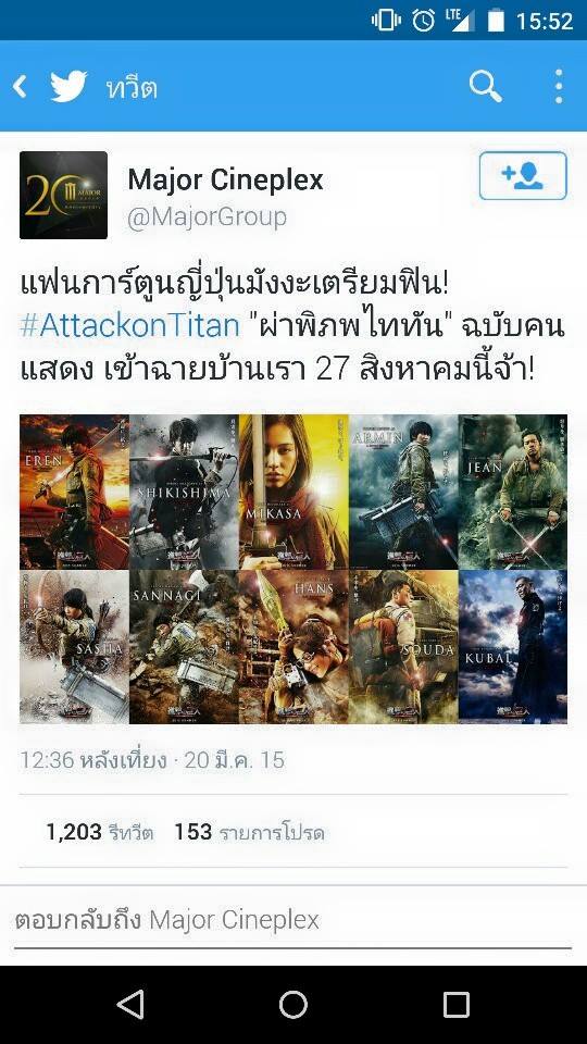 หลังจากที่ปล่อยภาพนักแสดงในเรื่องมาให้เห็นได้ซักพักแล้วกับภาพยนตร์ Attack on Titan Live Action และตอนนี้ทางต้นสังกัดก็ได้ปล่อยตัวอย่างภาพยนตร์แบบเต็มๆตัวแรกออกมาให้เราได้ชมพร้อมกับประกาศวันเข้าฉายที่ญี่ปุ่นวันที่ 1 กันยายน 2015 และล่าสุดโรงภาพยนตร์เมเจอร์ ไอ้ออกมาประกาศทางทวิตเตอร์ ว่าภาพยนตร์ Attack on Titan Live Action จะเข้าฉายที่ไทย 27 สิงหาคมนี้โดยเข้าหลังจากญี่ปุ่นเพียง 4 สัปดาห์เท่านั้น!!