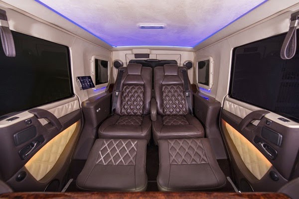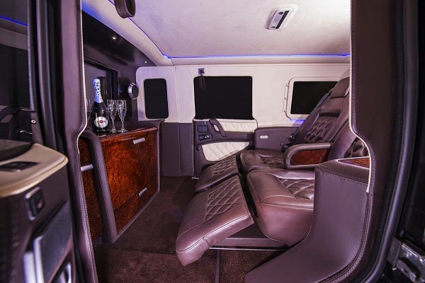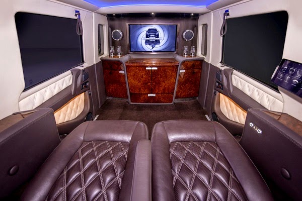 นี่ที่นั่งของผู้โดยสาร ซึ่งเบาะหุ้มหนังอย่างหรู ตลอดจนมีชั้นวางจากไม้เนื้อเยี่ยมสำหรับจิบไวน์