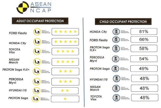 คะแนนที่สามารถรับได้ว่าเป็นรถยนต์ที่ปลอดภัยนั้นอยู่ที่ระดับ 4 ดาวขึ้นไป ซึ่งถ้าดูจากรายชื่อรถที่ทำการทดสอบของอาเซียน เอ็นแคปแล้ว ค่ายรถขนาดใหญ่มักไม่ค่อยมีปัญหาในเรื่องนี้ ขณะที่ค่ายรถยนต์ท้องถิ่นอาจจะยังต้องปรับปรุงแก้ไข