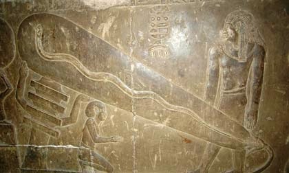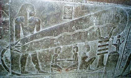 เริ่มแรกที่ภาพของงู ที่สองนักเขียนชาวออสเตรียกล่าวว่าเป็นลวดที่นำไฟฟ้า แต่ตำนานของชาวอียิปต์โบราณไม่มีตำนานใดกล่าวว่างูเกี่ยว ข้องกับไฟเลย ภาพวงรีที่เหมือนตัวหลอดไฟนั้น ณ ที่นี้มีความหมายถึงท้องฟ้า ยามรุ่งอรุณ และงูที่อยู่ด้าน ในก็คือเทพฮาร์ซัมตัส (Harsomtus) ซึ่งเป็นร่างหนึ่งของเทพฮอรัส เกี่ยวข้องกับพระอาทิตย์ ในยามรุ่งอรุณตามความเชื่อของชาวกรีก-โรมัน โดยที่พวกเขาจะแสดงภาพของเทพฮาร์ซัมตัสด้วยร่างของงูเสมอในช่วงหลัง 300 ปีก่อนคริสตกาลเป็นต้นมาครับ