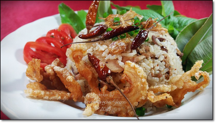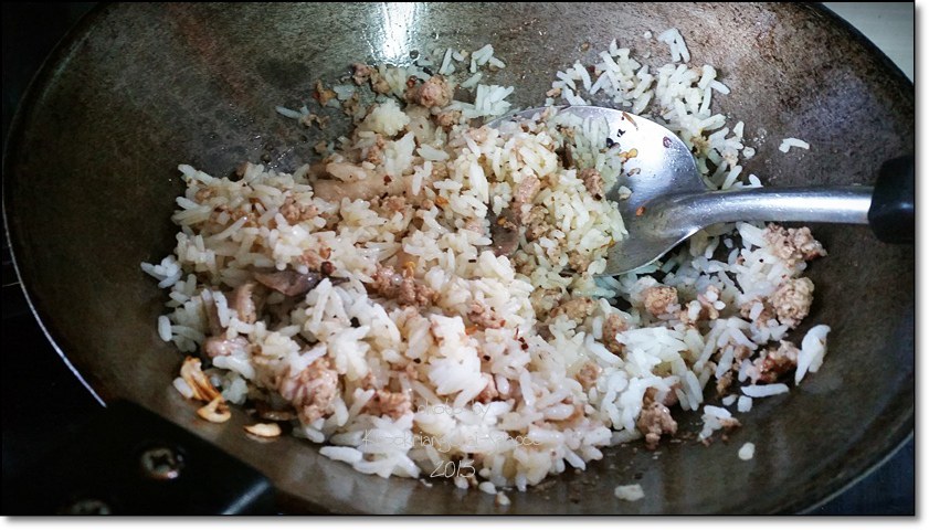 เอาลงผัดในกระทะ (คนเหนือเรียกตรงนี้ว่าคั่ว) พอดีเช้านี้มีแต่ข้าวเย็นเหลือมาจากเมื่อวาน ความขี้เกียจอุ่นก็เลยตักข้าว