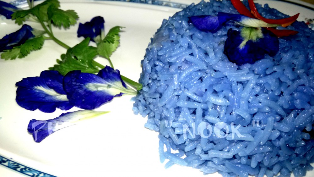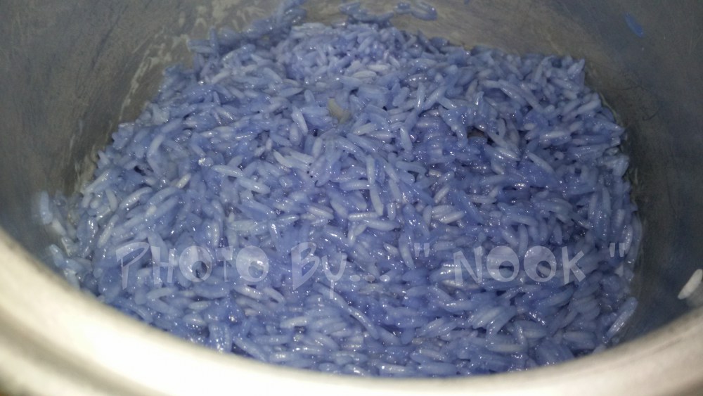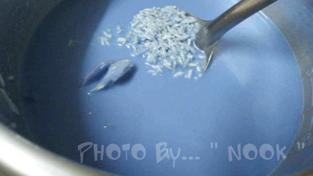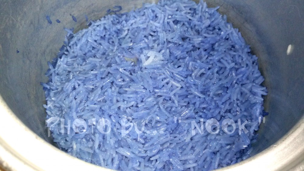 เริ่มด้วยล้างข้าวสารให้สะอาด เติมหอมแดงบุบลงไป ตามด้วยกะทิ น้ำดอกอัญชัน เกลือ กะน้ำแบบไม่ให้ข้าวแฉะ เน้นเม็ดข้าวร่วนๆ