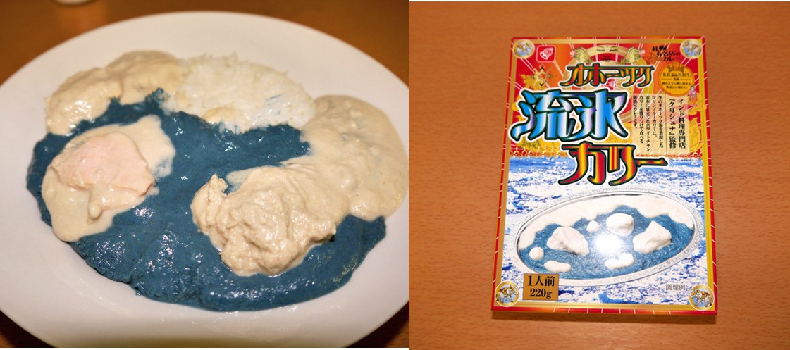 อีกหนึ่งความสวยงามของฮอกไกโดก็คือ Okhotsk Sea ที่จะมีธารน้ำแข็งลอยอยู่ในทะเลอันสวยงาม ดังนั้นก็เลยจัดการทำเป็นแกง...ซะเลยชื่อ "แกง...ธารน้ำแข็ง" ในซองมาพร้อมกับแกง...สองสี่ได้แก่สีนํ้าเงินที่เป็นตัวแทนของทะเล และสีขาวที่เป็นตัวแทนของธารนํ้าแข็ง รูปหน้ากล่องก็เหมือนจะสวยดี แต่พอเทออกมาแล้วดู เลอะๆ ยังไงไม่รู้ ฮ่าๆ