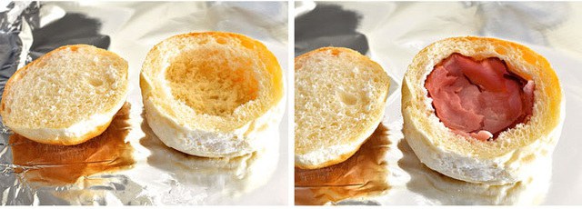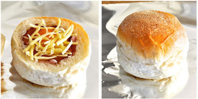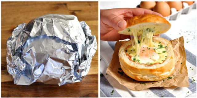 7.วางส่วนฝาของขนมปังกลับเข้าไป และห่อด้วยกระดาษฟอยล์ อบโดยใช้เวลาประมาณ 10-15 นาทีแล้วแต่ความชอบของแต่ละคน