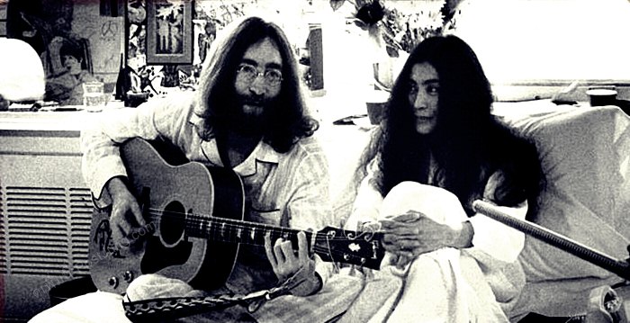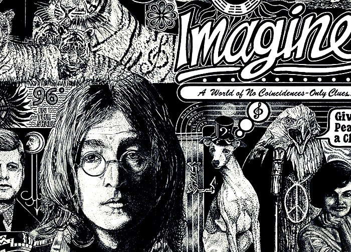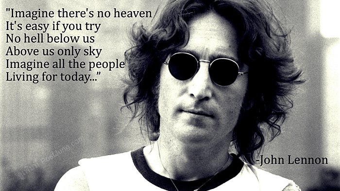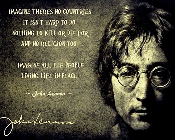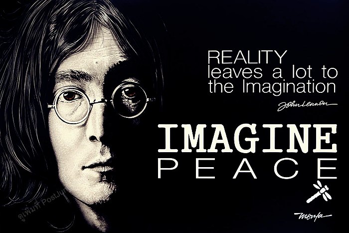 หนึ่งในสัญลักษณ์ของการเรียกร้องสันติภาพสำหรับมวลมนุษยชาติ คือเพลง "Imagine" (ค.ศ. 1971) เนื้อหาโดยรวมของเพลงอมตะบทนี้คือการเรียกร้องให้ผู้ฟัง และมวลมนุษย์ชาติทุก ๆ คน "จินตนาการ" ถึงสังคมยูโธเปีย ที่ปราศจากการแบ่งแยกชนชาติ ปราศจากการแบ่งแยกทางศาสนา ปราศจากสงคราม ปราศจากนรกและสวรรค์ ให้มวลมนุษย์ทุกคนฝัน จินตนาการ ถึงสันติภาพ