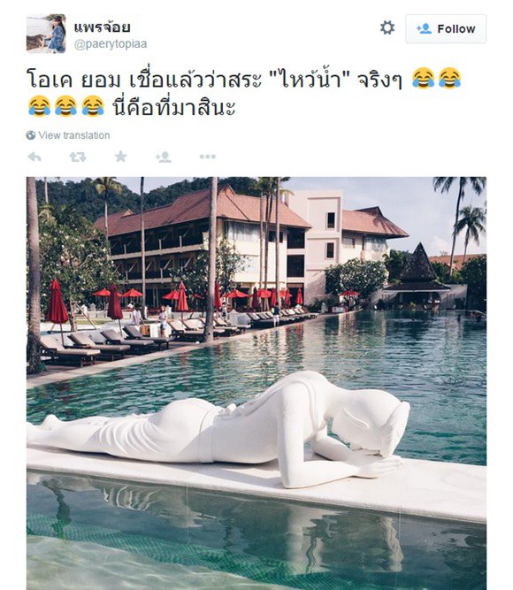"สระว่ายน้ำ" กับ "สระไหว้น้ำ" มันเป็นมุขตลกเชยๆ ที่เกิดมาทุกคนต้องเคยได้ยิน คำพ้องเสียงอย่าง แต่พอได้มาเจอสิ่งตกแต่งของโรงแรมสวยๆ แห่งหนึ่ง ต้องหยุดนิ่งไปกับดีไซน์ของสระน้ำของโรงแรม รูปปั้นงามสง่าตัวนี้ ไม่ต้องแฝงความหมายในศิลปะใดๆ ท่าทางก็บอกอยู่ แบบนี้ไง...สระ(ไหว้)น้ำ เลยละ