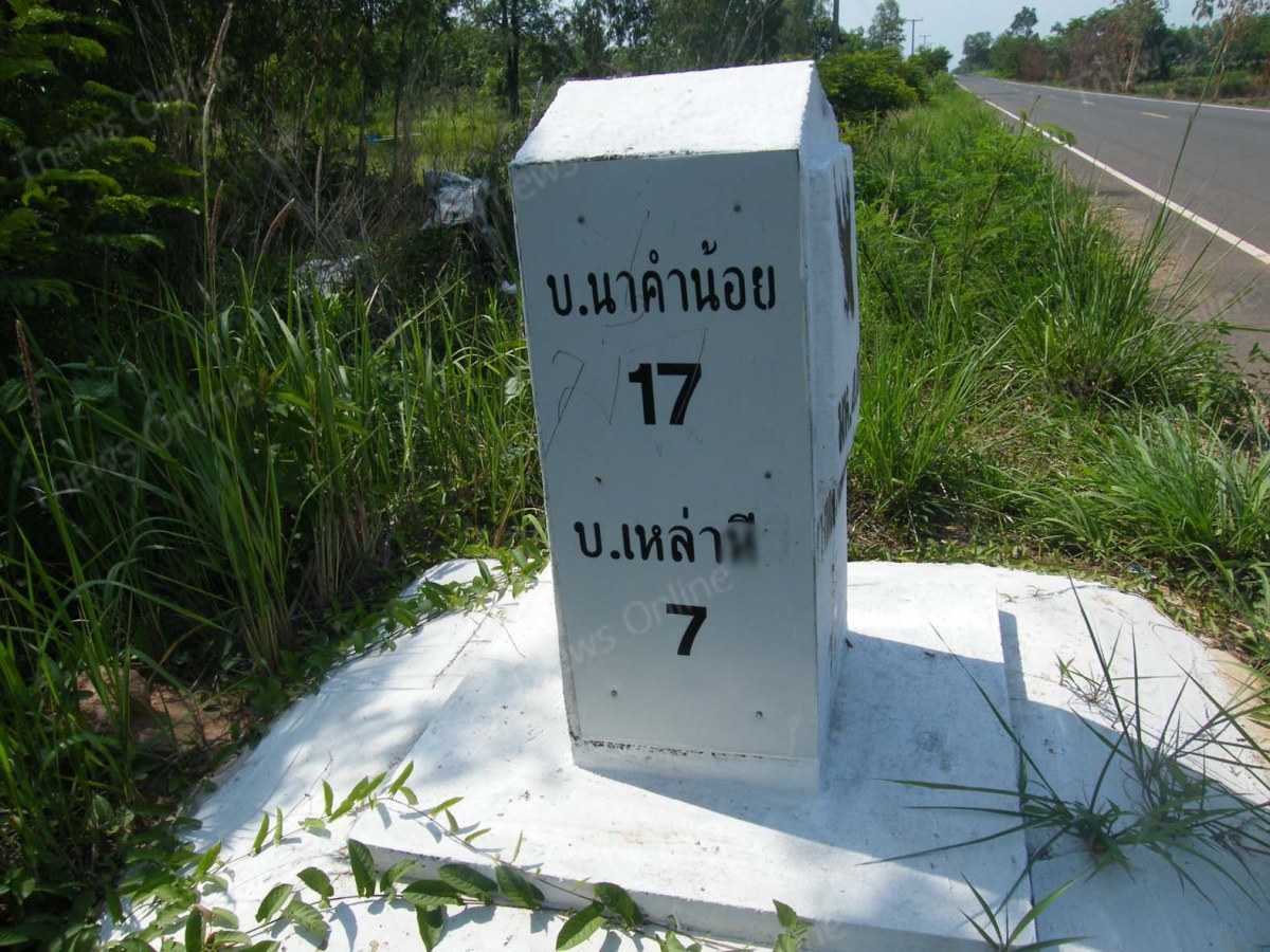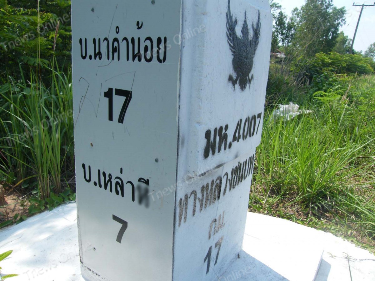 ป้ายหลักกิโลเมตร จ.มุกดาหาร เขียนชื่อหมู่บ้านผิด จาก "บ้านเหล่าหมี" กลายเป็นแบบไม่มี ตัวอักษร ม.ม้า คาดวัยรุ่นคะนองมาแกะตัวอักษร ม.ม้า ออก