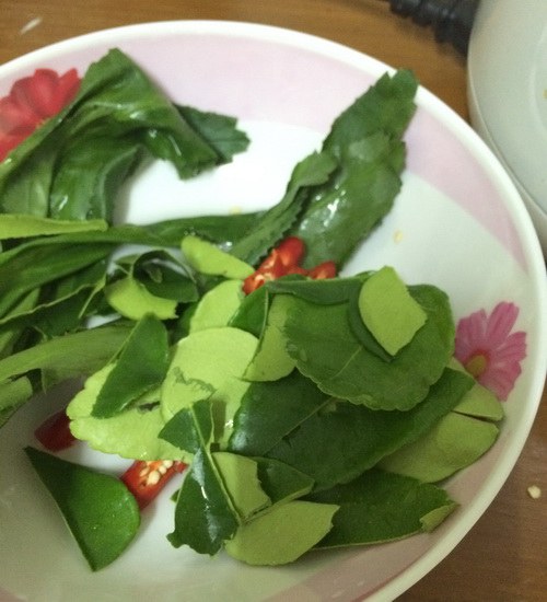 เปิดฝาหม้อค่ะใส่เครื่องต้มยำสำเร็จรูป คนสักพักให้เครื่องทั่วถึง ใส่ใบมะกรูด พริกสด ผักชีฝรั่งหั่นท่อน