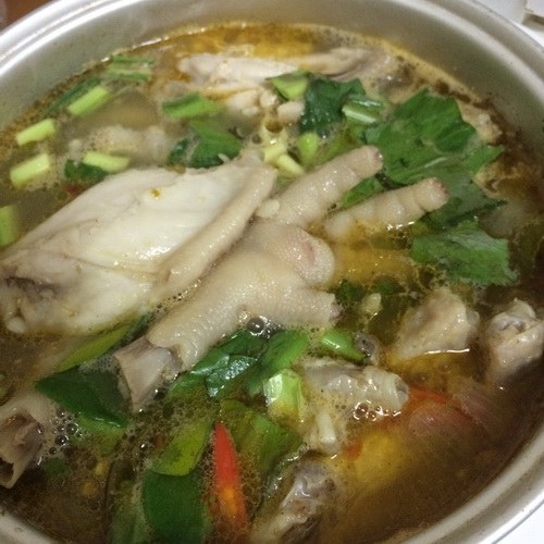 ลากันด้วยขาไก่ในหมอหุงข้าว ไม่มีการจัดจานใดๆทั้งสิ้น เพราะไม่ถ้วยเก๋ๆ บีบมะนาวใส่กล่องที่แถมมากับโยเกิร์ต