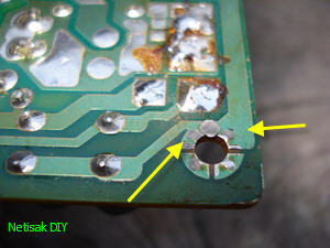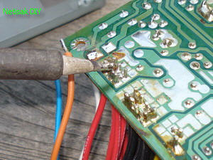 - เอาหัวแร้งร้อนๆ จี้ตะกั่วบนแผ่นปริ้นต์ ดึงสายไฟออก