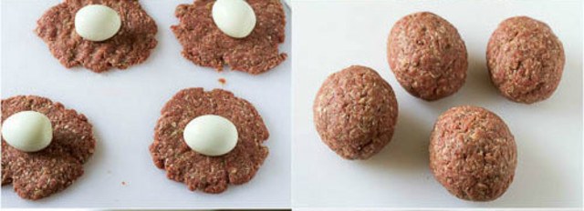 5.ต่อมาเอาเนื้อมาแผ่ให้มันแบนๆ เอาไข่โปะลงไป แล้วก็ห่อเนื้อให้มันคลุมไข่ทั้งหมด ! คลึงด้วยฝามือยูไลของสาวๆก็ได้จะได้ความกลมมน พยายามอย่าให้มีอากาศอยู่ระหว่างไข่กับเนื้อนะจ๊ะ