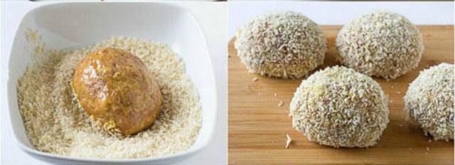 6.พอทำบอลเสร็จหมดทุกอันแล้ว ก็เอาบอลมาชุบแป้งทีละอันนะเธอ เดี๋ยวจะเละ ชุบแป้งเสร็จแล้วก็ชุบไข่ลงไปเลยจ้า