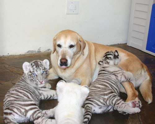 2. เจ้า “ลิชช่า” วัย 3 ขวบ สนุขพันธ์ลาบาดอร์ ทำหน้าที่เป็นแม่จำเป็นแก่เสือขาวทั้ง 3 ตัว