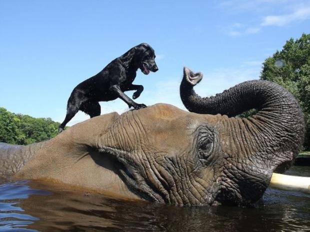 17. บับเบิ้ล ช้างแอฟริกาวัย 32 ปี กับเพื่อนรัก เบลล่า สุนัขพันธุ์ลาบาดอร์ วัย 3 ขวบ  ใน เทิลบีชซาฟารี แคโรไลน่า