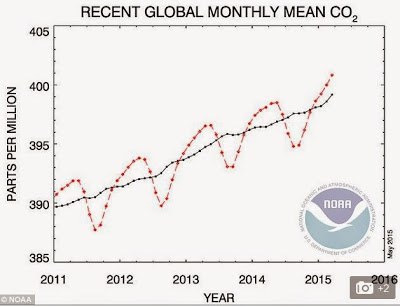 ส่วนข่าวร้ายต่อสภาวะแวดล้อม เป็นการเปิดเผยโดย National Oceanic and Atmospheric Administration หรือ NOAA ซึ่งพบว่าปริมาณคาร์บอนไดอ๊อกไซด์ (CO2) เฉลี่ยเมื่อเดือนมีนาคม 2015 ขึ้นสู่ระดับ 400.83 PPM (parts per million) และเป็นครั้งแรกที่ปริมาณเกินกว่า 400 PPM นับตั้งแต่เริ่มมีการวัดค่านี้ในทศวรรษ 1950 อย่างเป็นทางการและต่อเนื่อง จากหลักฐานที่นักวิทยาศาสตร์รวบรวบพบว่าครั้งล่าสุดที่โลกมีปริมาณคาร์บอนไดอ๊อกไซด์ระดับ 365 ppm ถึง 415 ppm เกิดขึ้นเมื่อ 4.5 ล้านปีก่อน