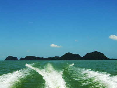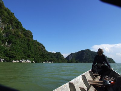 มาเข้าเรื่องกันต่อ หลังจากที่ได้ติดต่อกับเจ้าหน้าที่เรียบร้อยแล้ว ทีมเก็บรังนกก็พร้อมที่จะออกทำงาน (โชคดีครับ มาตรงช่วงนี้มีการเก็บรังนกพอดี) ตอนนี้ทุกคนก็จะได้รับอาวุธคนละอย่างก็คือ ไฟฉายติดหัว เพื่อเอาไว้เล็งเป้าหมายที่เราต้องการ เมื่อพร้อมเสร็จสรรพ ก็จับอาวุธของตนเอง ลงเรือหางยาว ครั้งนี้เราใช้เรือหางยาว 4 ในแต่ละลำก็จะมีมือปืนประจำ (เค้าบอกมาว่าป้องกันโจรบุกปล้น) ที่เห็นนั่งอยู่หัวเรือ ไม่ใช่มือปืนนะ แต่เป็นลุงหว่าง ปู่โสมเผ้าทรัพย์แห่งเกาะสีเกาะห้า หรือผู้เชี่ยวชาญเรื่องรังนก