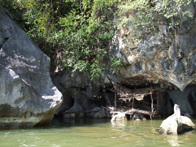 ทางเข้าถ้ำรังนก สังเกตุว่าจะมีคนเฝ้านั่งสังเกตุการอยู่ที่หน้าถ้ำ เพื่อป้องกันการลักลอบเข้ามาเก็บรังนก สำหรับถ้ำที่จะเข้าครั้งนี้มีชื่อว่า "ถ้ำน้ำ" ถ้ำน้ำเป็นถ้ำที่ไม่มีพื้นที่เป็นดินให้เราลงไปเดินเลย การทำงานต้องมีกลุ่มที่ต้องลงน้ำเพื่อกางตาข่าย และเตรียมอุปกรณ์ปีนป่าย ส่วนอีกกลุ่มคืออยู่บนเรือคอยส่องแสงสว่างขึ้นไปข้างบน