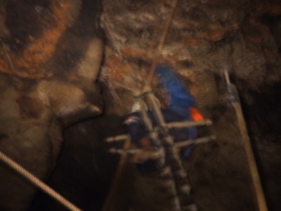 (ขออภัยภาพนี้ครับ ไม่ชัด การถ่ายภาพในถ้ำรังนกคือห้ามใช้แฟลช เพราะจะไปรบกวนนกก็เลยได้ภาพมาอย่างที่เห็นครับ)การเก็บรังนก เป็นเรื่องที่ต้องอาศัยความชำนาญทั้งทีมงานครับ เพราะเป็นเรื่องที่เกี่ยวข้องกับความสูง การปีนขึ้นเก็บรงนกนั้น เริ่มโดยการใช้ไม้ไผ่ต่อความยาวตามความสูงแต่ละถ้ำ (ที่เห็นคือประมาณตึก 4 ชั้น)และใช้ไม้ไผ่มัดประกบอีก 2 หรือ 3 ลำเพื่อความแข็งแรง ผูกเชือกจากปลายยอดลงมา 4 ด้าน เพื่อดึงหรือยึดให้ลำไผ่ตั้งตรง ต่อจากนั้นนักปีนป่ายก็ทำงาน โดยนั่งอยู่ปลายยอด คอยเอาไม้เก็บที่มีเหล็กปลายแบน แซะรังนกลงมา