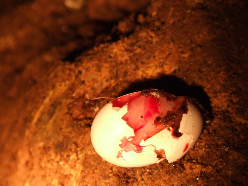 และนี่คือสิ่งที่ตกลงมาพร้อมๆกับรัง "ไข่นก" ตัวอ่อนที่ใกล้จะออกจากเปลือกลืมตาดูโลก ต้องมาจบด้วยมนุษย์ผู้โหดร้าย ผมจากที่กำลังเพลินกับการถ่ายรังที่ตกลงมาอย่างไม่หยุดหย่อน ต้องหลบฝนไข่ที่ตกลงมาแบบว่าเยอะมาก เพราะหนึ่งรังมีไข่มากกว่า 1 ฟอง และคนเก็บก็ไม่ได้มีแค่หนึ่งคน สิ่งที่เจอตอนนั้นคือ ไข่ที่ตกลงมาเป็นร้อยๆ