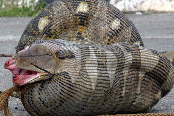 สักครั้งในชีวิตล่ะน่า ที่ผมคิดว่าแต่ละคนต้องสงสัยว่า งูมันกินสัตว์ที่ตัวใหญ่กว่าได้ไง ปากนิดเดียว คำตอบดูเอาได้ตามรูปเลยครับ แต่ก่อนเชื่อกันว่ามันถอดขากรรไกรได้ แต่ความรู้ในตอนนี้คือ เปล่าเลย แต่ปากมันมีกล้ามเนื้อพิเศษที่ยืดหยุ่นสูง ขากรรไกรล่างสองอันก็เคลื่อนไหวได้อิสระจากกัน นี่คือเคล็ดลับอ้าปากกว้างของงู
