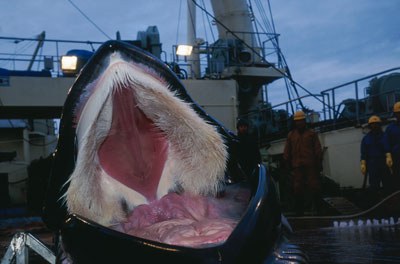 ถ้าสิ่งที่เห็นขาวๆ ในปากคือฟัน ก็น่าจะเป็นฟันที่นุ่มนิ่มมากๆ เพราะมันเป็นระบบเอาไว้กรองกุ้งเคย (krill) จากน้ำทะเลเอามากินนั่นเอง ระบบกรองนี้มีชื่อว่า baleen ซึ่งมีองค์ประกอบของ kelatin เหมือนในเล็บกะผมของคนเราเลย