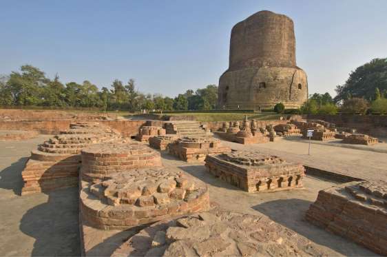 ธรรมเมกขสถูป สร้างขึ้นในปีค.ศ. 500 แทนที่โครงสร้างเดิมที่สร้างขึ้นในสมัยพระเจ้าอโศก บนพื้นที่ป่าอิสิปตนมฤคทายวัน หรือป่ากวาง ที่พระพุทธองค์ทรงแสดงปฐมเทศนาแก่ปัจญวัคคีย์