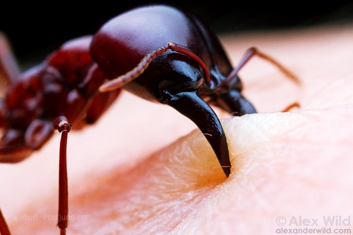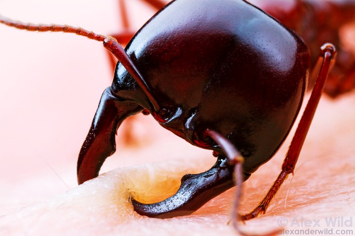 เนื่องจาก Dorylus มีเขี้ยวที่แข็งแรงมาก เมื่อคนถูกมันกัดและพยายามดึงออกมักไม่สามารถดึงออกได้แม้จะดึงจนตัวมดขาดเป็น 2 ท่อนเขึ้ยวมดก็ยังฝังอยู่ในเนื้อ ทำให้ชนเผ่าพื้นเมืองของแอฟริกาใช้เขี้ยวมดชนิดนี้เย็บแผลบนร่างกายด้วยการใช้มดนี้กัดและฝังเขี้ยวไว้ที่ 2 ด้านของปากแผลก่อนหักตัวมดเป็น 2 ท่อน ซึ่งเขึ้ยวของมันสามารถยีดปากแผลไว้ได้หลายวัน