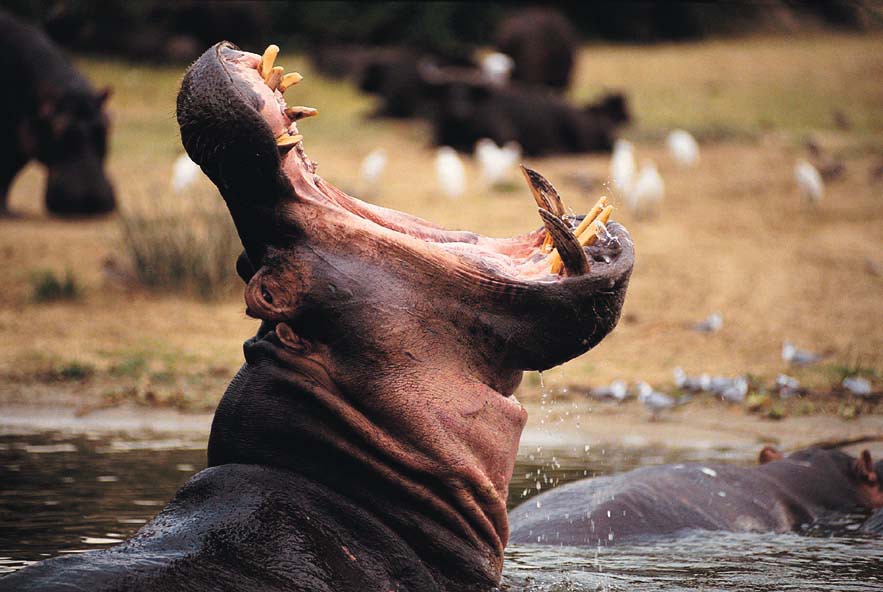 คุณอาจคิดว่าเจ้าสัตว์ตัวอ้วนกลมอย่างฮิปโปจะไม่มีพิษภัยอะไร กรุณาคิดซะใหม่ เพราะฮิปโปเป็นสัตว์ที่เอาแน่เอานอนทางอารมณ์ไม่ได้เลย มันอาจจะนอนแช่น้ำอยู่นิ่งๆ ก้จะวิ่งพรวดขึ้นมาไล่กัดคุณแบบไม่มีปี่มีขลุ่ยก็ได้ และด้วยเขี้ยวคู่หน้าที่ยาวกว่า T-rax สองเท่า แถมอยู่ในปากขนาดมหึมา รับรองว่าอะไรก็ตามที่โดนมันกัด จะหมดทางรอดทันที ที่สำคัญสถิติการฆ่าคนในแอฟริกาของฮิปโปต่อปีนั้น มากกว่าสัตว์เลี้ยงลูกด้วยนมชนิดอื่น ๆ รวมกันเสียอีก