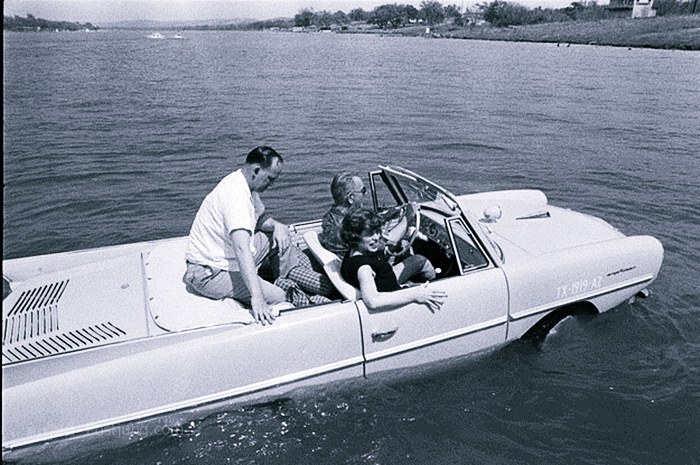 รถสะเทินน้ำสะเทินบกในเยอรมัน วางขายในปี 1961 ซึ่งประธานาธิบดี LBJ มีอยู่หนึ่งคัน และชอบล้อเล่นและแกล้งแขกที่นั่งอยู่ด้วยว่า “เบรคแตก!!! เรากำลังจะพุ่งตกน้ำ” และก็ขับลงทะเลสาบลงไปจริงๆ