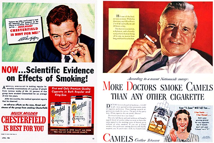 ในช่วงปี 1930s ถึง 1950s คนในสหรัฐฯ เชื่อว่าการสูบบุหรี่ดีต่อสุขภาพ และก็ไม่มีการค้านใดๆ จากหน่วยงานทางด้านการแพทย์ ทำให้มีโฆษณาของบริษัทบุหรี่ออกมามากมาย ถึงประโยชน์จากการสูบบุหรี่ จนกระทั่งถึงปี 1960s ที่มีการออกมาอย่างจริงจัง พร้อมผลวิจัยว่า การสูบบุหรี่ อาจมีผลทำให้เป็นโรคมะเร็งนั่นเอง
